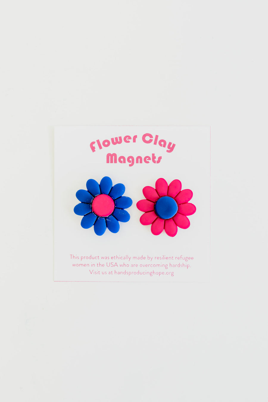 Add some flare to your fridge with these adorable flower clay magnets! These magnets were handmade by refugee women who now call Baton Rouge, LA their home.