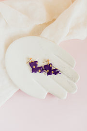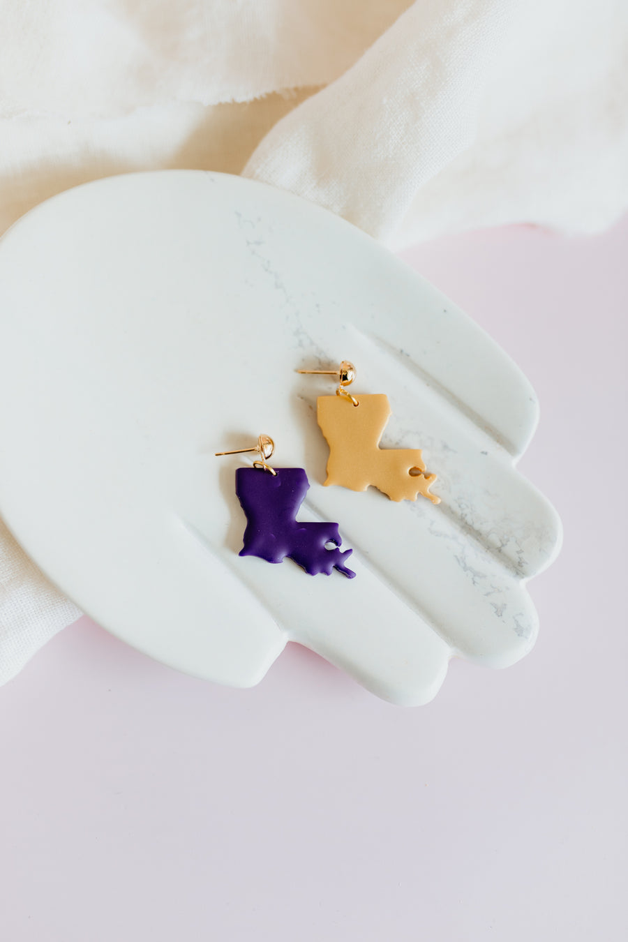 Our LSU dangly studs were handmade thoughtfully by immigrant and refugee artisans who now call Baton Rouge, Louisiana home! When you wear our purple and gold Louisiana shaped earrings on a gold ball stud, you are wearing a women's creativity, innovation and hard work--all of which have helped her to achieve a fair wage, new skills, and educational opportunities!