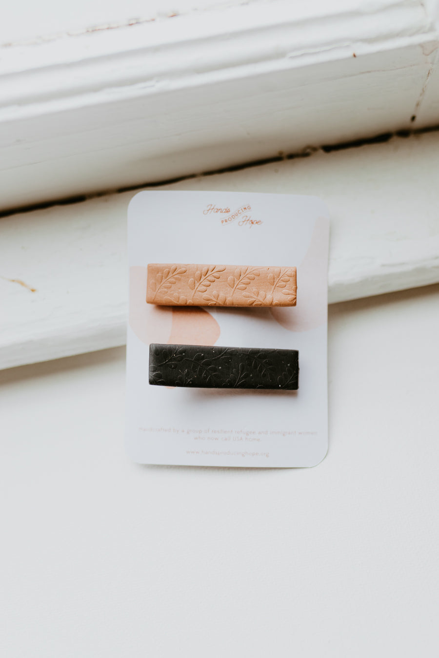 These fair-trade hairclips make the perfect simple but classy accessory! These beautiful polymer clay clips were handmade by our refugee partner Layla!