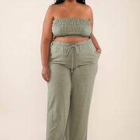 This wide leg, full-length rayon linen pant with a ruffle elastic waistband, tie at front, and side pockets is the perfect pant for summer!